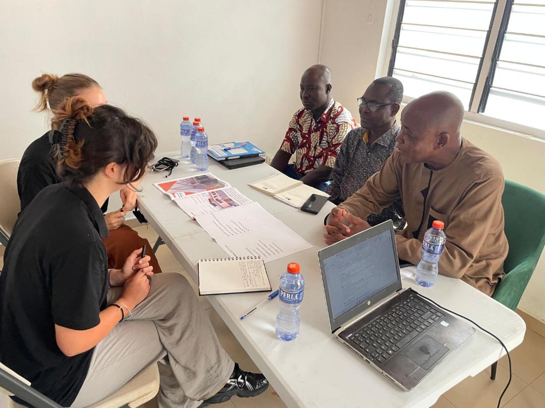 Anna und Anika Studierende an der Technischen Universität Wien in einem Workshop mit Architekten und Lehmbauingenieuren des Projektteams vor Ort in Togo. Fotocredit @Anna & Anika